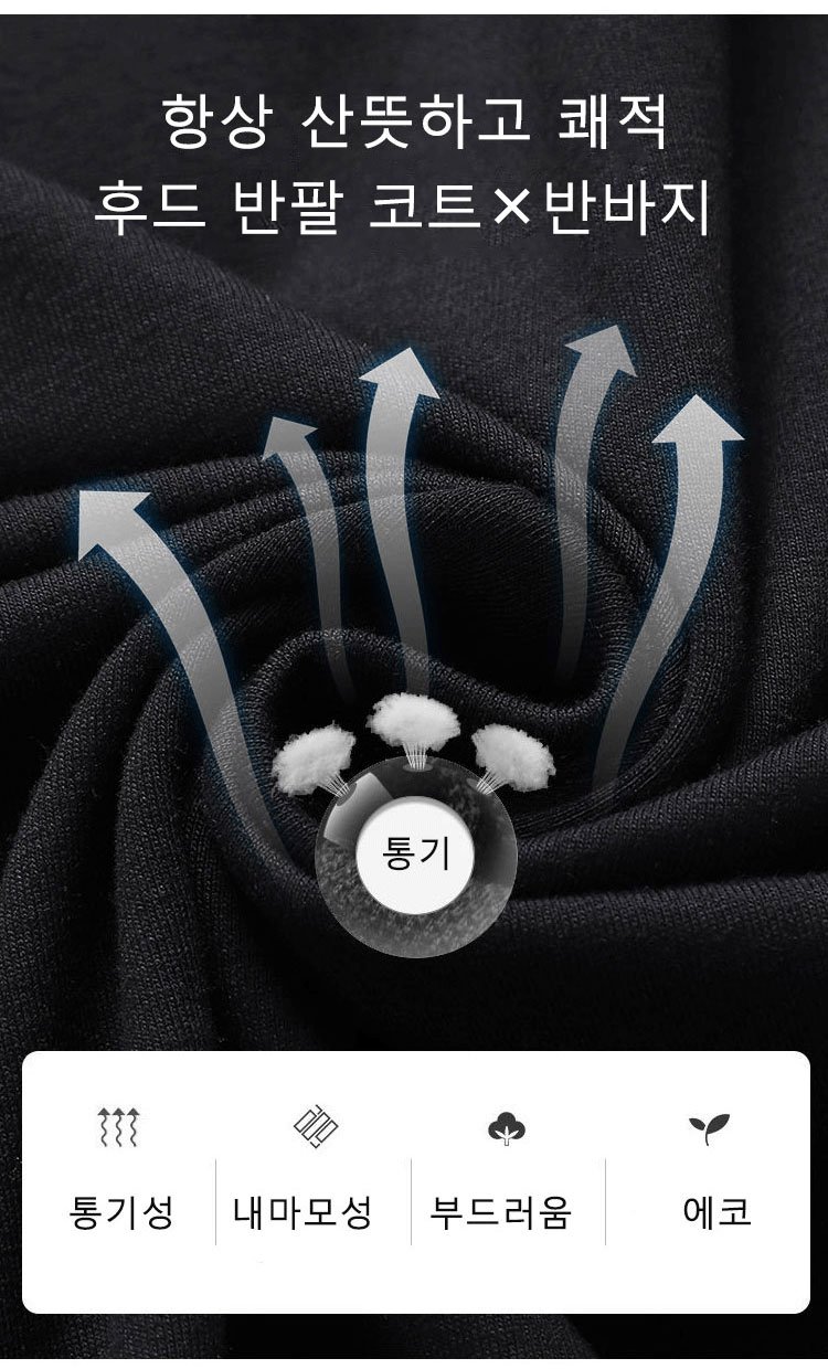 후드 반팔 코트 × 반바지  여름철에 활약하는 세트,항상 산뜻하고 쾌적. 1세트₩37,900;2세트₩49,900